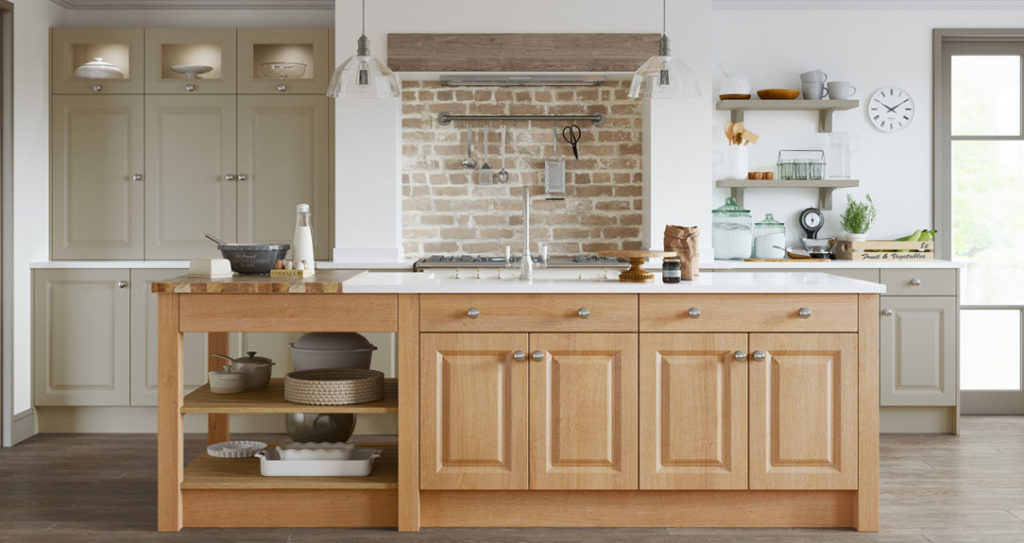 The traditional Miami with its sculpted curved doors is a kitchen for all seasons. The smooth finish of the Serica Dakar provides an beautiful contrast to the natural characteristics of the untouched oak island unit.